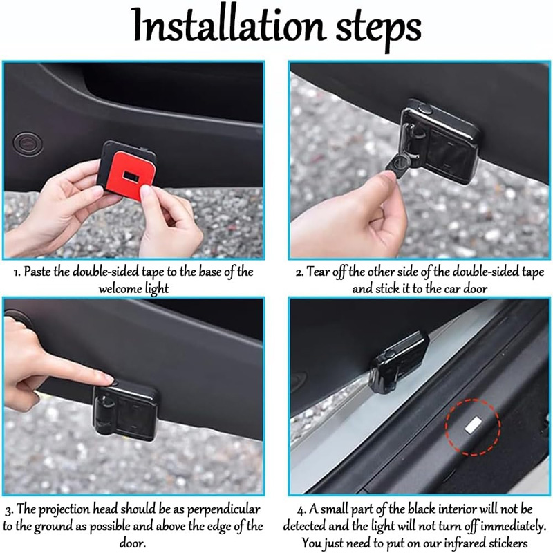 Automatic Sensing Switch 🚪: The projection light immediately illuminates when the door is opened, projecting a clear car logo onto the ground; it automatically turns off when the door is closed. No additional operation is required – intelligent and convenient, enhancing every moment of driving! 🔋 Customized Projection 🎨: You can customize your car logo or image to your liking, making your door projection light truly unique. Customization services meet all your creative needs! ✨ Enhance the Car Interior Atmosphere💡: The car door projection lights not only provide illumination, but their bright projection adds a sense of ceremony and prestige to you and your car. Whether you're getting in or out of the car, the projected logo makes your vehicle more attractive. 💖